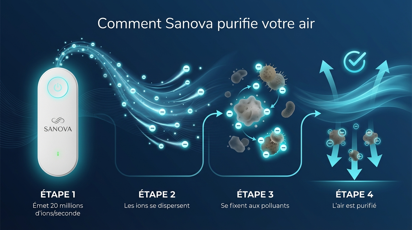 Sanova™ génère 20 millions d'ions négatifs par seconde qui neutralisent les particules dans l'air.